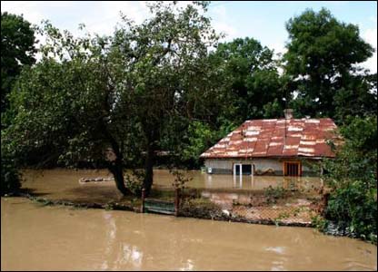 Затоплений будинок у селі Нижнів Тлумацького р-ну Івано-Франківської обл., 27 липня 2008 р. У Івано-Франківській обл. в результаті стихії без зв’язку залишилися 610 населених пунктів. Фото УНІАН