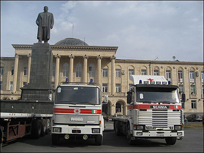 Допомога від Червоного Хреста біля мерії міста Ґорі. Саме на цю площу впала касетна бомба, від якої загинув голландський журналіст. Від бомби не лишилося слідів – асфальт поклали заново.