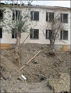 Воронка від російської ракети біля їдальні на військовій базі у Ґорі.