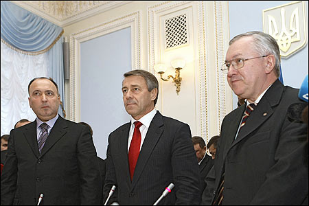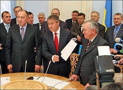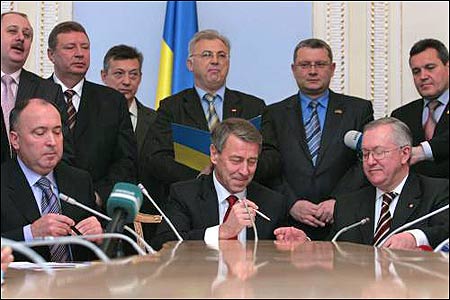 Зліва направо: новообраний керівник фракції Блоку Литвина Ігор Шаров, лідер "бютівської" фракції Іван Кириленко й заступник голови фракції НУ-НС Борис Тарасюк на церемонії підписання коаліційної угоди - 16 грудня 2008 року. Фото Укрінформу