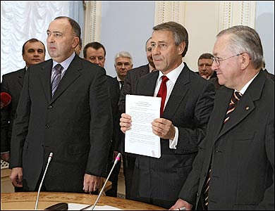 Зліва направо: новообраний керівник фракції Блоку Литвина Ігор Шаров, лідер "бютівської" фракції Іван Кириленко й заступник голови фракції НУ-НС Борис Тарасюк демонструють щойно підписану коаліційну угоду - 16 грудня 2008 року. Фото Укрінформу | ||||||||||||||||||||||||||||||||||||||||||||||||||||||||||||||||||||||||||||||||