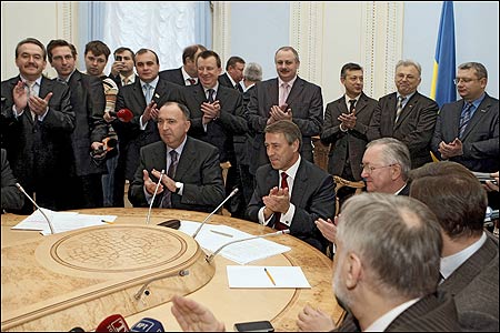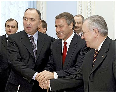 Ігор Шаров, лідер "бютівської" фракції Іван Кириленко й заступник голови фракції НУ-НС Борис Тарасюк вітають щойно підписану коаліційну угоду - 16 грудня 2008 року. Фото Укрінформу
