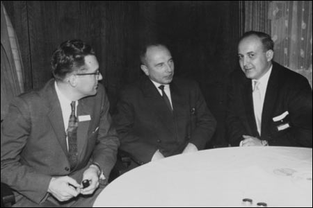 Провідник ОУН Степан Бандера (в центрі) з канадійськими парламентарями - послом Джоном Пелетом та доктором Іваном Кучерепою, які перебували на конференції НАТО в Парижі. Вони поїхали на зустріч з Бандерою до північно-західної Німеччини 27 листопада 1958 року.