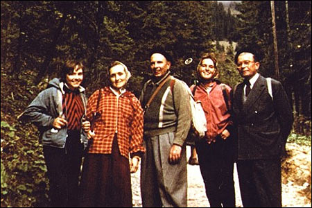 Степан Бандера з родиною в Альпах. Зліва направо: дочка Леся, дружина Ярослава, Бандера, дочка Наталя та член проводу ОУН Дмитро Миськів. Середина 50-х років.