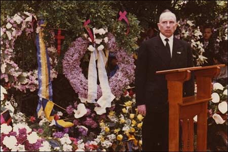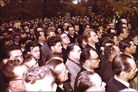 Виступ Степана Бандери в голандському Ротердамі на могилі Євгена Коновальця в 20-ту річницю вбивства Коновальця агентом НКВД. Фотографія 1958 року.