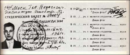 Посвідчення (студентський квиток) агента КГБ Богдана Сташинського, коли той вчився в Московському педагогічному інституті іноземних мов по спеціальності "німецька мова". Квиток видано в 1961-му році - двома роками після вбивства Бандери в Мюнхені.