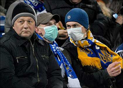 Вболівальники ФК ”Динамо” (Київ) у респіраторних масках під час матчу 12-го туру Прем’єр-Ліги України з футболу між ФК ”Динамо” (Київ) та ФК ”Карпати” (Львів) у Києві, в суботу, 31 жовтня 2009 р. Матч закінчився внічию з рахунком 1:1. Фото УНІАН