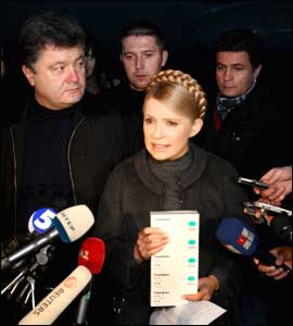 Міністр закордонних справ України Петро Порошенко (ліворуч) і Прем'єр-міністр України Юлія Тимошенко в аеропорту "Бориспіль" відповідають на запитання журналістів 2 листопада 2009 року. Фото Укрінформу | ||||||||||||||||||||||||||||||||||||||||||||||||||||||||||||||||||||||||||||||||