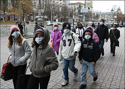 Люди у марлевих пов’язках на одній з вулиць Тернополя, в неділю, 1 листопада 2009 р. Фото УНІАН
