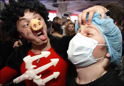 Учасник святкування Гелловіну у респіраторній масці в одному з нічних клубів у Києві, в ніч з 31 жовтня на 1 листопада 2009 р. Фото УНІАН