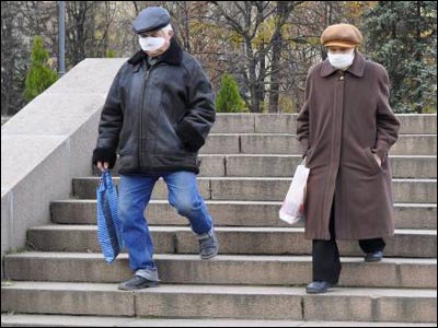 Літні люди у респіраторних масках на одній з вулиць Харкова в неділю, 1 листопада 2009 р. Фото УНІАН