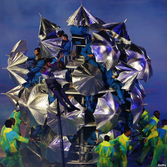Парасольки стали важливим атрибутом церемонії. На початку зіграли пісню співачки Ріанни "Парасолька". Назви країн під час параду учасників також розмістили на парасольках.