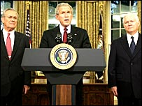 Президент Буш відреагував на поразку республіканців у проміжних виборах до конгресу США і оголосив про відставку міністра оборони Дональда Рамсфельда, якого вважають архітектором американської стратегії в Іраку. Президент повідомив, що Дональд Рамсфелд погодився, що після його шестирічної роботи на посаді міністра оборони настав час для нової людини з новими поглядами. Новим шефом Пентагону призначено колишнього директора ЦРУ Роберта Гейтса, але його ще чекає затвердження у сенаті. Про його біографію і перспективи нового міністра оборони США розповідає кореспондент Бі-Бі-Сі Роб Уотсон: Пан Гейтс керував ЦРУ у 90-ті роки за президента Джорджа Буша старшого.