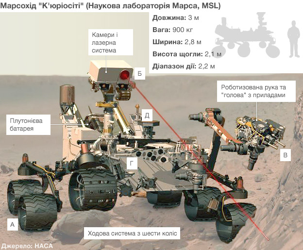 (Г) Вибурені з каменя або викопані з грунту зразки може проаналізувати високотехнологічна лабораторія, що міститься в нутрощах марсохода.