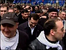 Опозиція твердить, що протестуватиме допоки президент Саакашвілі не піде у відставку. Опозиція вирішила закликати президента Саакашвілі піти у відставку в день річниці тих подій. Серед лідерів цього руху - Ніно Бурджанадзе; вона критикує президента в основному за розв'язання конфлікту, який торік призвів до війни з Росією. Поки незрозуміло, чи має опозиція досить сили, щоб змусити президента до дострокових виборів. | Також на цю тему Грузія готується до протестів у річницю Тбіліської трагедії09 квітня, 2009 | СВІТ Тбілісі обурений заявами Кремля03 квітня, 2009 | СВІТ Грузія готується до масштабної акції протесту01 квітня, 2009 | СВІТ У Грузії заарештовано членів опозиції24 березня, 2009 | СВІТ Євробачення пропонує Грузії ''змінити пісню''11 березня 2009 | КУЛЬТУРА I CУСПІЛЬСТВО Грузини згадали окупацію 88 років тому26 лютого, 2009 | СВІТ Розмороження конфліктів на Кавказі26 лютого 2009 | ДОКЛАДНО | |||||||||||||||||||||||||||||||||||||||||||||||||||||||||||||||||||||||||||||||