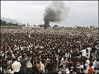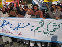 ادھر جموں سے بی بی سی کی نامہ نگار بینو جوشی کے مطابق ہندوستان کے زیر انتظام جموں و کشمیر کے جموں خطے میں بھی شری امرناتھ شرائن بورڈ سے واپس لی گئی اراضی کے خلاف مظاہرے جاری ہيں اور اس دوران ایک فرد ہلاک اور ایک درجن سے زیادہ افراد زخمی ہوئے ہیں۔ پولیس کا کہنا ہے کہ کرفیو کے باوجود جموں سے دو سو کلومیٹر دور واقع کشتواڑ میں ہندوؤں اور مسلمانوں کے درمیان تصادم ہوا ہے۔ دونوں فریقین ایک دوسرے کے املاک پر حملے کر رہے ہيں اور گھروں کو آگ بھی لگا ر ہے ہيں جس سے کئی مکانات اور گاڑیوں کو نقصان پہنچا ہے۔ حکام کا کہنا ہے ان جھڑپوں میں ایک مسلمان ہلاک ہوگیا ہے اور بعد ازاں بھیڑ کو منتشر کرنے اور حالات کو قابو میں کرنے کے لیے پولیس نے ہوائی فائرنگ بھی کی ہے۔ لیفٹینٹ کرنل ایس ڈی گوسوامی نے کہا کہ فوج کو مقامی حکام کے کہنے کے بعد حالات پر قابو پانے کے لیے کشتواڑ بھیج دیا گيا ہے۔ |