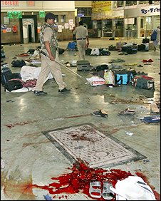 بھارت کے شہر ممبئی میں سلسلہ وار حملوں میں ایک سو ایک افراد ہلاک اور دو سو سے زیادہ زخمی ہوئے ہیں۔ حملوں کے وقت بی بی سی کی پراچی پنگلے شہر میں تھیں، انہوں نے تباہی اور ہلاکتوں کے مناظر یوں بیاں کیے۔ ’بھیرو سنگھ سنہا چھترپتی شیواجی ٹرمنس (سی ایس ٹی) پر اپنے خاندان کے افراد کے ہمراہ وارانسی جانے کے لیے ٹرین کا انتظا ر کر رہے تھے کہ وہ اندھا دھند فائرنگ میں گھرگئے۔ حملے میں ان کے پوتے اور پوتی شدید زخمی ہوگئے۔ حملوں میں ہلاک یا زخمی ہونے والوں میں سب سے زیادہ تعداد سی ایس ٹی پر ہونے والی فائرنگ کی زد میں آنے والوں کی ہے، یہاں دو بندوق برداروں نے ٹرینوں کے منتظر مسافروں پر فائرنگ شروع کر دی۔ جنوبی ممبئی کے سینٹ جارج ہسپتال میں اب تک تریسٹھ افراد کی ہلاکت کی تصدیق ہوچکی ہے۔ تقریباً سو زخمیوں کو دیگر ہسپتالوں میں بھیجا گیا ہے۔ ڈاکٹروں کا کہنا ہے کہ مرنے والوں کی اکثریت گولیوں کا نشانہ بنی ہے۔ ہسپتال کے رسیپشن کا منظر ہولناک تھا۔ کئی لاشیں ایک عارضی احاطے میں پڑی ہوئی تھیں، اور رشتہ دار اپنے عزیزوں کی شناخت کے لیے آ رہے تھے۔ ڈاکٹروں کا کہنا تھا کہ جن زخمیوں کو انتہائی طبی نگہداشت کی ضرورت تھی انہیں جے جے اور دیگر ہسپتالوں ’ ہم تو وارانسی (بنارس) واپس جانے کے لیے انتظار کر رہے تھے، میں ٹکٹ لینے گیا تھا کہ فائرنگ شروع ہوگئی، جب تک میں اپنے گھر والوں کے واپس پہنچتا ان لوگوں نے بہت لوگوں کو مار دیا تھا۔‘ |