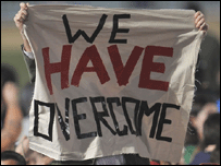 امریکہ کے تاریخ ساز صدارتی انتخابات میں ڈیموکریٹک پارٹی کے امیدوار باراک اوباما ملک کے پہلے سیاہ فام صدر منتخب ہوگئے ہیں۔ ریپبلکن پارٹی کے امیدوار جان مکین نے اپنی شکست تسلیم کرتے ہوئے باراک اوباما کو ٹیلی فون پر مبارک باد دی۔ اوباما کی کامیابی کو امریکہ میں سیاہ اور سفید فاموں کے درمیان تعلقات میں ایک نئے باب کا آغاز قرار دیا جارہا ہے۔ صدر منتخب ہونے کے لیے اوباما کو دو سو ستر ووٹ درکار تھے جو انہوں نے بہ آسانی حاصل کر لیے۔ زیادہ تر ریاستوں میں ابھی ووٹوں کی گنتتی جاری ہے لیکن رجحانات کی بنیاد پر اب یہ واضح ہو گیا ہے کہ جان مکین پر وہائٹ ہاؤس کے راستے بند ہوگئے ہیں۔ جان مکین کے لیے ضروری تھا کہ اپنے امکانات زندہ رکھنے کے لیے وہ پینسلوینیا اور اوہایو میں کامیابی حاصل کریں لیکن دونوں ریاستوں نے اپنا فیصلہ اوباما کے حق میں سنایا۔ مبصرین کے مطابق اس انتخاب میں ’بریڈلی افیکٹ‘ کا کوئی اثر دیکھنے میں نہیں آیا۔ یعنی یہ خطرہ بے بنیاد ثابت ہوا کہ کچھ سفید فام ووٹر جو انتخابی جائزوں میں اوباما کی حمایت کی بات کر رہے تھے، وہ بالآخر سفیدفام امیدوار کو ووٹ دیں گے۔ نامہ نگاروں کے مطابق جان مکین کو خدشہ تھا کہ وہ آئیووا اور نیو میکسیکو میں ہار جائیں حالانکہ ان دونوں ہی ریاستوں نے گزشتہ انتخابات میں ریپبلکن پارٹی کا ساتھ دیا تھا۔ لہذا وہ یہ کمی پینسلوینیا میں پوری کرنا چاہتے تھے۔ ڈیموکریٹک پارٹی نے سینیٹ اور ایوان نمائندگان پر بھی اپنی گرفت مضبوط کر لی ہے۔