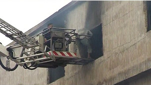 فائر بریگیڈ کی دو سنارکلز کے ذریعے عمارت سے لاشیں نکالی جا رہی ہیں