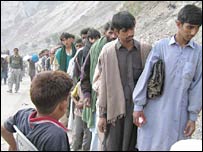 دوسری طرف مظفرآباد سے چھ کلومیٹر دور وادئ نیلم کو جانے والی سڑک کے کنارے شہر اور علاقے کی سڑکوں کو دوبارہ تعمیر کرنے کا جذبہ مایوسی اور مستقبل سے ناامیدی میں بدل رہا ہے۔ سیکڑوں افراد کی قطاریں ایک خیمے پر ختم ہوتی ہیں جہاں سے انہیں بسکٹ کے ایک پیکٹ اور پانی کی بوتل سے زیادہ کچھ نہیں ملےگا۔ لیکن یہ بھی سچ ہے کہ قطار میں لگے ہوئے لوگوں کے لیے ایک گھنٹے کے انتظار کا یہ انعام کسی نعمت سے کم نہیں۔ ایسا کیوں ہے، یہ سمجھنا زیادہ مشکل نہیں۔ وادئ نیلم جہاں سے دریائے نیلم (جسے بھارت میں کشن گنگا کہتے ہیں) گزرتا ہے ایک دو سو کلومیٹر طویل اور تنگ پہاڑی علاقہ ہے اور یہ وادی اس زلزلے سے سب سے زیادہ متاثر ہونے والے علاقوں میں سے ہے۔