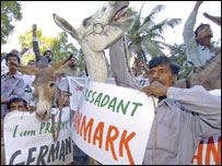 پریس مارکیٹ محلہ جنگی میں منگلو کو علامتی ہڑتال ہوئی اور مظاہرین نے ڈنمارک کے پرچم کو نذر آتش کر دیا۔ پشاور میں امریکی سفارت خانے پر بھی سیکورٹی بڑھا دی گئی ہے اور بڑی تعداد میں پولیس وہاں تعنیات کی گئی ہے۔ اسی مسئلہ پر صوبہ بھر میں بدھ کے روز بھی تاجر برادری کی کال پر ہڑتال بھی کی جائے گئی۔ کراچی سے ریاض سہیل کی رپورٹ یورپ کے اخبارات میں توہین آمیز کارٹون کی اشاعت کے خلاف کراچی اور اندرون سندھ میں بھی احتجاجی مظاہرے اور شٹر بند ہڑتال کی گئیں۔ یہ مظاہرے اہلسنت و جماعت، سنی تحریک اور عوامی تحریک کی جانب سے کئے گئے۔ مظاہرے کے دوران ڈنمارک کے پرچم کو بھی نذر آتش کیا گیا جبکہ فرانس، ناروے اور ڈنمارک سمیت امریکہ کے خلاف نعرے بازی کی گئی۔ اس سے قبل اہلسنت و جماعت کے رہنماؤں نے ایک پریس کانفرنس کرتے ہوئے کہا کہ توہین رسالت کے مسئلے پر حکومت کا رد مسلمانان کے رد عمل کی عکاسی نہیں تا۔ انہوں نے مطالبہ کیا کہ مسجد نبوی میں اسلامی کانفرنس کا ہنگامی اجلاس طلب کیا جائے جس میں تمام سربراہان عہد کریں کہ توہین رسالت کے مرتکب افراد اور اداروں کی پشت پناہی کرنے والی حکومتوں کا تجارتی اور سفارتی بائکاٹ کیا جائیگا۔ اہلسنت و جماعت کی جانب سے جمعرات کے روز قائد اعظم کی مزار سے ایک ریلی نکالی جائیگی۔ علما نے لوگوں سے اپیل کی کہ ریلی میں شریک ہوکر بھرپور احتجاج رکارڈ کروایا جائے۔ دوسری جانب سندھ کے دوسرے بڑے شہر حیدرآباد، کوٹڑی،کوٹ غلام محمد،گولاڑچی،جھڈو،بھریا میں کاروبار بند رہا اور احتجاجی جلوس نکالے گئے۔ | اسی بارے میں پشاور: کارٹونوں پراحتجاج وتوڑ پھوڑ13 February, 2006 | پاکستان کارٹون: ایم ایم اے کا احتجاجی پروگرام11 February, 2006 | پاکستان ’کارٹون چھاپنے والے کی دوائیاں نہیں‘10 February, 2006 | پاکستان | ||||||||||||||||||||||||||||||||||||||||