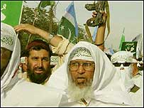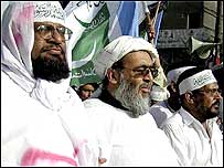 انہوں نے کہا ہم کہتے ہیں کہ ہمارے جذبات سے مت کھیلو یہ آگ کا کھیل ہے جل جاؤ گے۔ حافظ حسین احمد نے خطاب میں کہا کہ ایم ایم اے کے رہنماؤں کو گرفتار کر کہ حکومت اپنی شکست تسلیم کرچکی ہے۔ ان کا کہنا تھا کہ ہم غیر آئینی حکومت کو اقتدار میں رہنے نہیں دینگے۔ ہم دو جرنیلوں کو اپنے انجام تک پہنچا چکے ہیں تیسرے کو بھی پہنچائیں گے۔ انہوں نے پاک فوج کے جوانوں اور جرنیلوں کو مخاطب کرتے ہوئے کہا کہ ریٹائرڈ فوجی سربراہ کو اٹھا کر باہر پھینک دو ورنہ عوام تہمارے سامنے کھڑے ہوجائیں گے۔ حافظ حسین احمد نے کہا کہ جنرل مشرف پارلیمینٹ میں تو آنے کی ہمت نہ کرسکے اب وہ اسلام آباد آنے کی بھی جرات نہیں کرسکیں گے۔ انہوں نے کہا کہ گستاخ سلمان رشدی، تسلیمہ نسرین اور کارٹونسٹ کا جو بھی سر قلم کرے گا وہ آخرت میں سرخرو ہوگا۔ ایم ایم کے بانی مولانا شاہ احمد نورانی کے فرزند اور جمعیت علما پاکستان کے رہنما شاہ محمد اویس نے اعلان کیا کہ گستاخ رسول کو جو قتل کریگا میں اس کو ایک کروڑ روپے دونگا۔ گرفتاریاں ہمیں بزدل نہیں بنا سکتی ہیں۔ | اسی بارے میں اسلام آباد مظاہرہ: گرفتاریاں ونظربندی19 February, 2006 | پاکستان کارٹونوں کے خلاف خواتین ریلی18 February, 2006 | پاکستان کارٹون ہنگامے، چنیوٹ میں 4 زخمی18 February, 2006 | پاکستان کارٹونسٹ کے قاتل کیلیے 10 لاکھ ڈالر17 February, 2006 | پاکستان اسلام آباد: ڈنمارک کا سفارتخانہ بند17 February, 2006 | پاکستان کراچی: احتجاج تشدد میں تبدیل17 February, 2006 | پاکستان کراچی:کاروبار اور ٹرانسپورٹ بند17 February, 2006 | پاکستان ہر قیمت پرامن و امان کی ہدایات 15 February, 2006 | پاکستان | ||||||||||||||||||||||||||||||||||||||||