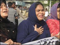 انہوں نے بتایا کہ عابد کو فون آیا کہ پولیس نے بلایا ہے جس پر وہ تھانے چلاگیا اور پھر گھر واپس نہیں آیا مگر اب پولیس یہ ماننے کو تیار نہیں ہے۔ امام بارگاہ شاہ خراساں سے گرفتار ہونے والی ناصر حسین کی ماں نے بتایا ’ہمیں معلوم نہیں کہ انہیں کیوں گرفتار کیا گیا ہے ہمیں کوئی بتانے والا بھی نہیں ہے‘۔ گرفتار ہونے والے نوجوان علی حیدر کی بیوی نے جن کے ساتھ ایک سال کی بچی بھی تھی کہا کہ ’انہیں کوئی احساس نہیں ہے بے گناہوں کی مائیں بہنیں رستوں پر آگئی ہیں‘۔ انہوں نے کہا کہ اگر ان کے شوہر نے کوئی جرم کیا ہے تو اسے ثابت کریں، ’ہمیں یہ تو بتایا جائے کہ انہیں اس ملک کی ایجنسی نے گرفتار کیا ہے یا امریکی ایجنسی نے‘۔ واضح رہے کہ نشتر پارک بم دھماکے کے بعد تحقیقاتی اداروں کی جانب سے بڑی تعداد میں مختلف جماعتوں کے لوگوں کو حراست میں لیا گیا تھا مگر کسی کو بھی سامنے نہیں لایا گیا۔ | اسی بارے میں فرقہ واریت: ڈھائی سو افراد گرفتار16 December, 2005 | پاکستان عاشورہ پر سخت حفاظتی اقدامات09 February, 2006 | پاکستان روضہِ عسکری میں دھماکے پر احتجاج23 February, 2006 | پاکستان کراچی میں بم دھماکہ، تین زخمی06 April, 2006 | پاکستان لاہور میں ہڑتال، کراچی بھی بند13 April, 2006 | پاکستان شیعہ عالم دین اور ڈرائیور ہلاک 18 April, 2006 | پاکستان کالعدم تنظیم سپاہ صحابہ کے رہنما رہا19 April, 2006 | پاکستان | ||||||||||||||||||||||||||||||||||||||||
