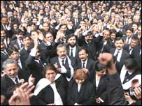 آفس میں ساتھی کو اطلاع کرنے کے بعد میں ویسے ہی راولپنڈی کا چکر لگانے کے ارادے سے مری روڈ پر چل نکلا۔مری روڈ کے فیض آباد پر پولیس کی بھاری نفری نے ناکہ لگا رکھا تھا۔ راولپنڈی کے ایس ایس پی کی سربراہی میں کئی سو پولیس اہلکار اسلام آباد جانے والی پرائیویٹ اور پبلک ساری گاڑیوں کی تلاشی لے رہے تھے اور جس کسی گاڑی میں ان کو کالے کوٹ والا کوئی بھی بظاہر معزز شخص دکھائی دے رہا تھا وہ اسے زبردستی گاڑی سے اتار کر قریب ہی کھڑی پولیس کی قیدیوں کے لیے مخصوص گاڑی میں بٹھا کر تھانے لے جا رہے تھے۔ راولپنڈی پولیس کی یہ پریکٹس صبح سے جاری تھی اور کئی کالے کوٹ تھانہ بدر ہو چکے تھے۔ وہاں پر کھڑے ایک راہگیر نے میرے ہاتھ میں مائیک دیکھ کر کہا آپ ان سے پوچھیں کہ انہوں نے ہمارے بچے کو کیوں پکڑا ہے ۔آصف نام ہے اس کا اور قریب کے ہوٹل پر کام کرتا ہے ۔ابھی پکڑ کر اس گاڑی میں بٹھایا ہے نام بھی نہیں بتا رہے۔قیدیوں والی گاڑی ہر طرف سے بند تھی اور پولیس بھی بچے کے بارے میں کچھ نہیں بتا رہی تھی۔