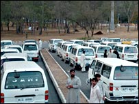 ٹریفک پولیس کے ایک سب انسپیکٹر محمد حنیف سے جب پوچھا کہ وہ عوامی گاڑیاں کیوں پکڑ رہے ہیں تو انہوں نے کہا کہ راول ٹاؤن کے ناظم راشد شفیق نے انہیں حکم دیا ہے کہ گاڑیاں پہنچاؤ۔ ان کے مطابق راشد شفیق وزیرِ ریلوے شیخ رشید احمد کے بھتیجے ہیں۔ انہوں نے بتایا کہ ان کی حدود میں چھ سو اڑسٹھ گاڑیاں پکڑی جا چکی ہیں اور باقی ابھی کچھ آرہی ہیں۔ جب ان سے پوچھا کہ دیگر تھانوں پر بھی گاڑیاں پکڑی ہیں تو انہوں نے کہا کہ پکڑی ہوں گی لیکن انہیں معلوم نہیں۔ قریب ہی واقعہ ایک کھلے میدان میں بھی گاڑیاں کھڑی تھیں اور ہر گاڑی میں ڈرائیور اور کلینر بیٹھے تھے اور ان میں سے کئی پولیس اور حکومت کوگالیاں بھی دے رہے تھے۔ واضح رہے کہ نالہ لئی کی دونوں جانب سولہ ارب روپے کی لاگت سے بائیس کلومیٹر تک ’نان سٹاپ‘ سڑک تعمیر کی گئی ہے اور صدر جنرل پرویز مشرف ستائیس مارچ کو اس کے افتتاح کے بعد ایک جلسہ عام سے خطاب کرنے والے ہیں۔ اس سے قبل حکومت نے بیشتر اخبارات میں پورے صفحے کے رنگین اشتہار شائع کرائے ہیں اور راولپنڈی شہر میں جگہ جگہ صدر جنرل پرویز مشرف، وزیراعلیٰ پرویز الہیٰ، وزیر اطلاعات شیخ رشید احمد اور مسلم لیگ کے مقامی رہنماؤں کی بڑی تصاویر والے بینر، پوسٹر اور بورڈ لگائے گئے ہیں۔ واضح رہے کہ صدر جنرل پرویز مشرف بارہا کہہ چکے ہیں کہ یہ انتخابات کا سال ہے اور انہوں نے مختلف شہروں میں جلسے بھی منعقد کیے۔ صدر کے جلسوں کو حزب مخالف انتخابی مہم قرار دیتے ہوئے ان پر تنقید کر رہی ہے کہ وہ سرکاری اخراجات پر حکمران مسلم لیگ قائد اعظم کی مہم چلا رہے ہیں۔ | اسی بارے میں کارٹون احتجاج: ہڑتال، ٹرانسپورٹ بند03 March, 2006 | پاکستان لاہور کی ناکہ بندی، کرفیو کا سماں26 February, 2006 | پاکستان ’موجودہ بسیں، ویگنیں ختم کریں‘23 December, 2006 | پاکستان | ||||||||||||||||||||||||||||||||||||||||