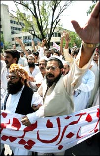دارالحکومت اسلام آباد میں نمازِ جمعہ کے بعد مظاہرین سڑکوں پر نکل آئے اور حکومت کے اس اقدام کے خلاف شدید نعرے بازی کی۔اسلام آباد میں متحدہ مجلس عمل کی کال پر سینکڑوں احتجاجی مظاہرین نے جلوس نکالا۔ جلوس کے شرکاء نے بینر اور کتبے اٹھا رکھے تھے جن پر حکومت مخالف نعرے درج تھے۔ احتجاجی جلوس سے خطاب کرتے ہوئے مقررین نے جہاں ایک طرف لال مسجد کی انتظامیہ کے رویے سے لاتعلقی کا اعلان کیا وہیں حکومت کی جانب سے کیے جانے والے آپریشن کی شدید مذمت کی۔ پشاور سے بی بی سی کے نامہ نگار عبدالحئی کاکڑ کے مطابق صوبہ سرحد میں سب سے بڑا مظاہرہ ایم ایم اے کے زیر اہتمام ضلع بٹگرام میں کیا گیا ہے جس میں ایک اندازے کے مطابق پندرہ سو سے زیادہ افراد نے شرکت کی۔مظاہرے سے خطاب کرتے ہوئے مقررین نے الزام لگایا کہ جنرل مشرف امریکہ کے ایجنڈے پرعمل پیرا ہیں اور بقول انکے جنرل مشرف اور صدر بش کے سوچ وفکر میں کوئی تضاد نہیں ہے۔ پشاور میں بھی ایم ایم اے کے زیر اہتمام ہونے والے مظاہرے میں صوبائی وزیر امان اللہ حقانی اور ایم این اے صابر اعوان اور دیگر مقررین نے سپریم کورٹ سےمطالبہ کیا ہے کہ وہ لال مسجد کیخلاف فوجی آپریشن کا از خود نوٹس لیتے ہوئے ایک عدالتی کمیشن تشکیل دیں تاکہ حقائق عوام کے سامنے لائے جاسکیں۔انہوں دھمکی دی کہ اگر جنرل پرویز مشرف نے مساجد اور مدارس کیخلاف مہم جاری رکھی گئی تو اسلام آباد تک احتجاجی مارچ کیا جائے گا۔اسکے علاوہ صوبہ سرحد کے دیگر علاقوں نوشہرہ، مردان،چترال، ڈی آئی خان ،مانسہرہ ، ہنگو اور کالاڈھاکہ میں بھی مظاہرے کیے گئے ہیں۔ |