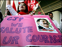 ایئرپورٹ سے چیف جسٹس افتخار محمد چودھری نے ڈسٹرک بار کی طرف سفر شروع کیا تو ان کے استقبال کے لیے آئے ہوئے لوگوں نے ایک بڑے جلوس کی صورت اختیار کر لی۔ اس جلوس میں ہر عمر کے لوگ اور ہر طبقہِ فکر سے تعلق رکھنے والے لوگ شامل تھے۔اس جلوس میں بے شمار گاڑیاں، وگنیں اور موٹر سائیکلیں شامل تھیں۔ چیف جسٹس افتخار چودھری نے لاہور ایئرپورٹ سے لاہور کینٹ کچہری تک کا چھ کلومیٹر کا سفر طے کرنے پر پہلا پڑاؤ کیا۔ یہاں وہ گاڑی سے باہر نہیں آئے لیکن ان کے وکلاء اعزاز احسن اور علی احمد کرد نے تقریریں کیں۔ اعتزاز احسن نے کہا کہ وکلاء تحریک کی پہلی منزل چیف جسٹس کی بحالی ہے اور دسری منزل شہریوں کے انسانی حقوق کا تحفظ کرنا ہے۔ ان کا کہنا تھا کہ چیف جسٹس کی بحالی کے بعد وہ وکلاء کارکنوں کو تنہا نہیں چھوڑیں گے اور جنرل مشرف ان کے جن خوابوں کو چکناچور کررہے ہیں ان کو پورا کیا جائے گا۔ انہوں نے مزید کہا کہ اس تحریک سے سیاسی جماعتوں اور کارکنوں کو اس لیے دور رکھا گیا ہے ’کیونکہ ہم عدالت میں پیروی کررہے ہیں۔ اور یہ نہ سمجھا جائے کہ ہم وکالت اور عدالت پر انحصار نہیں کررہے ہیں بلکہ سیاست پر کررہے ہیں۔‘ اس موقع پر علی احمد کرد نے اپنی تقریر میں کہا کہ چیف جسٹس افتخار چودھری کی بحالی کے بعد یہ تحریک ختم نہیں ہوجائے گی۔ ’یہ تحریک پاکستان کے کروڑوں عوام کی امید ہے۔ چیف جسٹس کی بحالی کے بعد ہم گھر نہں بیٹھیں گے، آمریت کا خاتمہ کیا جائے گا۔‘ انہوں نے مزید کہا کہ جنرل مشرف کی اقتدار میں موجودگی میں ’کوئی انتخاب منظور نہیں ہوگا، مشرف کو جانا ہوگا اور آئندہ جرنیل حکومت نہیں کرے گا۔‘ | اسی بارے میں ’نئی صبح طلوع ہو چکی ہے‘23 June, 2007 | پاکستان لاہور سے ملتان پینتیس گھنٹے میں24 June, 2007 | پاکستان ’سیاست سے کوئی تعلق نہیں‘24 June, 2007 | پاکستان چیف جسٹس کا دورہ منسوخ28 June, 2007 | پاکستان رِنگ ٹون کے بعد اب دستخطی مہم30 June, 2007 | پاکستان سمجھوتے کا کوئی امکان نہیں: کرد02 July, 2007 | پاکستان | ||||||||||||||||||||||||||||||||||||||||