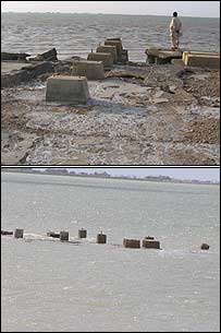 ان کا یہ بھی ماننا ہے کہ دریائی پانی کے بہاؤ میں جیسے جیسے کمی آئی سمندر کا پانی ڈیلٹا کی کھاڑیوں اور آبی گزرگاہوں میں بھرتا چلا گیا اور یہ زرخیز زمین سلیٹی صحرا میں بدل گئی۔ سمندر کے پانی نے نہ صرف ایک وسیع علاقے کو بنجر کر دیا بلکہ وہاں اگنے والے منگروو جنگلات کو بھی تباہ کر دیا۔ صوبہ سندھ کے وزیرِ آبپاشی اکمل لغاری کا کہنا ہے ’سنہ 1970 کے بعد سے ڈیلٹا کے ایک اعشاریہ تین ملین ایکڑ علاقے پر پھیلی ایک سو ساٹھ سے زائد آبادیاں سمندر کی نذر ہو چکی ہیں‘۔ اس علاقے میں رہائش پذیر افراد کے مطابق یہاں اب یا تو وہ لوگ ہیں جو اتنے غریب ہیں کہ کہیں اور نہیں جا سکتے یا پھر اپنے آبائی علاقے کو چھوڑ نہیں سکتے۔ کھارو چھان کے اسّی سالہ لوہار ابراہیم سومرو بھی ایسے ہی ایک شخص ہیں۔ ان کے مطابق’ مجھے وہ وقت یاد ہے جب یہ علاقہ ایک سرسبز جنت کی مانند تھا۔ پھر یہاں تبدیلی آنے لگی اور ہمارے اردگرد نمکین پانی بھرنے لگا۔ ابتداء میں ہم نے سوچا کہ حالات بہتر ہو جائیں گے لیکنپھر ہم اس کے عاادی ہوتے چلے گئے‘۔ | اسی بارے میں کراچی میں مردہ مچھلیاں اور تعفن29 July, 2007 | پاکستان پاکستان:’سنگین‘ موسمیاتی تبدیلیاں11 June, 2007 | پاکستان ’منجمد آبی ذخائر پگھل رہے ہیں‘10 June, 2007 | پاکستان گوادر! کونسا گوادر؟22 March, 2007 | پاکستان جزائر کا قضیہ: ماہی گیروں کا احتجاج10 January, 2007 | پاکستان حکومت کی تلخیوں کا شکار ماہی گیر20 November, 2006 | پاکستان جزائر کے حق ملکیت پر تنازعہ29 October, 2006 | پاکستان نیا دبئی اور ماہیگروں کے خواب05 October, 2006 | پاکستان | ||||||||||||||||||||||||||||||||||||||||