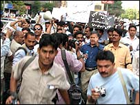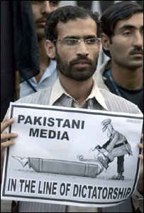 پنجاب میں بڑا مظاہرہ لاہور میں ہوا جس میں صحافیوں نے میڈیا پر عائد پابندیوں اور نجی ٹی وی چینلوں کی بندش کے خلاف لاہور پریس کلب سے بنجاب اسمبلی تک احتجاجی ریلی نکالی اور حکومت کے خلاف نعرے لگائے۔ احتجاجی صحافیوں نے سیاہ پٹیاں باندھ رکھی تھیں اور بینرز اور پلے کارڈز اُٹھا رکھے تھے جن پر صحافت کی آزادی کے حوالے سے بھی مختلف نعرے اور نظمیں درج تھیں۔ صحافی حکومت مخالف نعرے لگاتے ہوئے پنجاب اسمبلی کی سیڑھیوں تک پہنچے اور جذباتی تقاریر کیں۔ اس موقع پر ہیومن رائٹس کمیشن آف پاکستان کے سربراہ آئی اے رحمان نے صحافیوں سے خطاب کرتے ہوئے کہا کہ’ جب تک میڈیا پر عائد پابندیاں ختم نہیں ہوتیں صحافی اپنی جدوجہد جاری رکھیں‘۔پنجاب یونین آف جرنلسٹس کے صدر عارف حمید بھٹی کا کہنا تھا کہ اگر حکومت نے پیمرا قوانین میں کی گئی ترامیم کو واپس نہ لیا تو صحافی گرفتاریاں دیں گے۔ اس کے علاوہ ملتان، بہالپور، فیصل آباد اور گوجرانوالہ میں بھی صحافیوں نے آزادیِ اظہار پر لگائی گئی پابندیوں اور ایمرجنسی کے خلاف احتجاجی مُظاہرے کیے، ریلیاں نکالیں اور حکومت کے خلاف نعرے لگائے اور ایمرجنسی کے نفاذ کے خاتمے تک احتجاج جاری رکھنے کا اعلان کیا ہے۔ گرفتاریوں اور تشدد کی مذمت اس موقع پر پی ایف یو جے کے صدر ہما علی کا کہنا تھا کہ حقوق واپس لینے کے لیے اگر اب کوشش نہ کی گئی تو پھر کبھی نہیں ملیں گے۔ انہوں نہ کہا کہ صحافی آزاد رہنا چاہتے ہیں اور اسی کے لیے متحدہ جدوجہد کر رہے ہیں۔ رپورٹرز وِد آوٹ فرنٹئرز کے اقبال خٹک نے فوجی حکمرانوں پر کڑی تنقید کرتے ہوئے کہا کہ جنرل پرویز مشرف بظاہر درائع ابلاغ کی آزادی غصب کرنے پر تلے ہوئے ہیں۔ کراچی سے نامہ نگار ریاض سہیل کے مطابق سندھ ہائی کورٹ بار نے اعلان کیا ہے کہ گرفتار صحافیوں کی نہ صرف عدالت کے اندر اور قانونی بلکہ اخلاقی اور مالی مدد بھی کی جائےگی۔ ہائیکورٹ بار کے صدر ابرار حسن نے پولیس تشدد کی مذمت کرتے ہوئے کہا کہ وہ صحافیوں کے ساتھ ہیں اور بار کی جنرل باڈی میں بھی اس کی مذمتی قرار داد منظور کی جائےگی۔ ادھر متحدہ مجلس عمل نے پولیس کارروائی کو آمریت کی بدترین مثال قرار دیا ہے۔ اتحاد کے صوبائی صدر مولانا اسدللہ بھٹو نے کہا ہے کہ پولیس کی کارروائی سے حکمرانوں کی صحافت دشمن اور آمرانہ عزائم کی عکاسی ہوتی ہے۔ انسانی حقوق کمیشن نے کہا ہے صحافیوں پر بے رحمانہ تشدد کی ذمے دار سندھ حکومت ہے۔ تنظیم کے سیکرٹری جنرل اقبال حیدر نے ایک بیان میں کہا ہے کہ میڈیا پر پابندی نہ صرف پاکستان کے آئین کے منافی ہے یہ انسانی حقوق کے بین اقوامی چارٹر کے بھی خلاف ہے۔ انہوں نے مطالبہ کیا کہ گرفتار صحافیوں کو غیر مشروط طور پر فوری رہا کیا جائے۔ حقوقِ انسانی کی بین الاقوامی تنظیم ہیومن رائٹس واچ نے بھی کراچی میں صحافیوں پر پولیس تشدد کی مذمت کی ہے۔ |