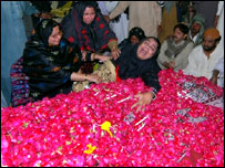 پاکستان کی سابق وزیراعظم اور پاکستان پیپلز پارٹی کی چیئر پرسن بینظیر بھٹو کے قبر پر چیف آف آرمی سٹاف جنرل اشفاق پرویز کیانی کی طرف سے پھولوں کی چار چڑھائی گئی ہے۔ پھولوں کی یہ چادر پاک فوج کے لاڑکانہ بریگیڈ کے افسروں نے چڑھائی جو سنیچر کی رات کو لاڑکانہ چیمبر آف کامرس اینڈ انڈسٹری کے ایک اعلیٰ عہدے دار کے ساتھ یہاں آئے تھے۔ ذرائع کے مطابق بینظیر بھٹو کی قبر پر پھول چڑھانے والے فوجی افسران سندھی ٹوپی، اجرک اور شلوار قمیض میں ملبوس تھے اور وہ ایک عام سویلین گاڑی میں رات گیارہ بجے وہاں آئے تھے جب پی پی پی کے کارکن وہاں سےجا چکے تھے۔ دوسری طرف ملک بھر سے پی پی پی کے کارکنوں کے قافلوں کی گڑھی خدا بخش آمد کا سلسلہ جاری ہے۔ پی پی پی کارکن اپنے ساتھ پھولوں کے گلدستے لا رہے ہیں اور اس وقت تک بینظیر بھٹو کی قبر پر ڈالی جانے والے مٹی سے زیادہ بڑا ڈھیر ان پھولوں کا ہے۔ کارکنوں کی کئی ٹولیاں تلاوت قران میں مصروف ہے اور کچھ کارکن مشرف مخالف اور پاکستان مخالف نعرے لگا رہے ہیں۔ |
