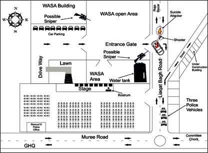 لیکن ابن رضوی کہتے ہیں کہ ’دنیا نے دیکھا ہے، ویڈیو فوٹیجز موجود ہیں کہ پولیس کی گاڑیاں مری روڈ پر پہنچ چکی تھیں، اگر پولیس والے ساتھ ہوتے تو کیا صرف ایک پولیس اہلکار ہلاک ہوتا؟ میں دعوے سے کہتا ہوں کہ راولپنڈی کو پانی فراہم کرنے والے ادارے واسا کی عمارت میں آٹھ دس مشکوک افراد بیٹھے رہے۔ میں نے خود پولیس سے کہا کہ انہیں ہٹاؤ لیکن پولیس والوں نے کہا کہ یہ لوگ ڈیوٹی پر ہیں۔میں نے زیر تعمیر عمارت کے اوپر بیٹھے چادر اوڑھے داڑھی والے شخص کو ہٹانے کا کہا تو بھی پولیس نے انہیں نہیں ہٹایا‘۔ ان کا کہنا ہے کہ ’میں جلسہ کی انتظامی کمیٹی میں شامل تھا اور پولیس کے ساتھ طے ہوا تھا کہ بی بی آئیں گی مری روڈ سے اور واپس گوال منڈی سے جائیں گی، کیونکہ جلسہ ختم ہونے کے بعد عوام مری روڈ پر آجاتے ہیں۔ بھٹو صاحب ہوں یا بینظیر جب بھی لیاقت باغ آئے تو واپسی کا روٹ ہمیشہ گوال منڈی کی طرف سے رہا‘۔ اس بارے میں پولیس چیف کہتے ہیں کہ ’ہمارے پاس تحریری ثبوت موجود ہے کہ بینظیر بھٹو کی واپیس کا روٹ گوال منڈی سے طے نہیں ہوا تھا۔ پولیس کی تینوں گاڑیاں بینظیر بھٹو کے ساتھ تھیں تب ہی تو پولیس اہلکار زخمی ہوئے‘۔ ابن رضوی کہتے ہیں کہ ’محترمہ پر تین سمتوں سے فائرنگ ہوئی، اندھیرے میں کالے شیشوں والی عینک پہنے کمانڈو نما شخص کھلم کھلا پستول لے کر واسا کی عمارت سے باہر آیا، پولیس نے اُسے نہیں روکا اور اس نے بی بی کی گاڑی کے بائیں جانب فائرنگ کی اور دھماکہ بھی بائیں جانب ہوا۔ لیکن محترمہ کے سر پر زخم دائیں طرف کیسے ہوگیا؟ مجھے یقین ہے کہ بی بی کو کسی ماہر نشانچی نے واسا کی عمارت یا پانی کے ٹینک کے اوپر سے نشانہ بنایا ہے‘۔ اس بارے میں اصل حقائق تو سکاٹ لینڈ یارڈ کے ماہرین کی رپورٹ سے ہی پتہ چلیں گے۔ بینظیر بھٹو کی میڈیا ٹیم کے رکن نذیر دھوکی کہتے ہیں کہ ’حکومت اس بات کا جواب دے کہ بینظیر بھٹو کے ساتھ ایمبولینس کیوں نہیں تھی؟ ڈاکٹر مصدق مختصر وقت میں جنرل ہسپتال کیسے پہنچے؟ اور محترمہ کے قتل اور میڈیکل رپورٹ کا اعلان جنرل ہسپتال کے میڈیکل سپرنٹنڈنٹ کے بجائے ڈاکٹر مصدق نے کیوں کیا؟‘۔ ان سوالات کے بارے میں ڈاکٹر مصدق اور راولپنڈی جنرل ہسپتال کے متعلقہ عملے سے بارہا رابطے کی کوشش کی گئی لیکن کوئی بھی دستیاب نہیں ہوسکا۔