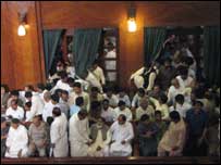 پیر مظہر الحق کا کہنا تھا کہ سیکیورٹی کے بہت ناقص انتظامات تھے سپیکر کو حکام کے ساتھ اجلاس کرنا چاہیے تھا۔ دوسری جانب سپیکر سید مظفر حسین شاہ نے پریس گیلری کے علاوہ تمام مہمانوں کے پاس منسوخ کردیے ہیں اور جماعتوں کو کہا ہے کہ وہ طے کریں کہ کس کو پاس جاری کرنے ہیں۔ | اسی بارے میں ’نصف ارکان کی پہلی اسمبلی‘28 March, 2008 | پاکستان سندھ:اتحاد سے قبل اعتراضات31 March, 2008 | پاکستان سندھ:’پیپلز پارٹی مفاہمت کی خواہاں‘01 April, 2008 | پاکستان سندھ: سپیکر کا انتخاب 7 اپریل کو01 April, 2008 | پاکستان ’معاف بھی کیا اور معافی بھی مانگی‘03 April, 2008 | پاکستان پی پی، ایم کیوایم مفاہمت کمیٹی03 April, 2008 | پاکستان بھٹو کی برسی اور بدلتے سیاسی رنگ04 April, 2008 | پاکستان | ||||||||||||||||||||||||||||||||||||||||