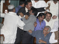 سپیکر نے فرار ہوکر جان بچائی۔ان کی جگہ ڈپٹی سپیکر شاہد علی نے سنبھال لی اور سپیکر کو پاگل قرار دینے کی قرار داد منظور کرتے ہوئے چھ ارکان کی معطلی کے فیصلے کو منسوخ کردیا۔اس پر حزبِ اختلاف کے ارکان مشتعل ہوگئے اور انہوں نے مائیکروفون اکھاڑ کر ڈپٹی سپیکر کو شدید زخمی کردیا۔دو روز بعد ڈپٹی سپیکر کا ہسپتال میں انتقال ہوگیا۔ انیس سو بہتر میں تشکیل پانے والی پاکستان کی پہلی منتخب اسمبلی میں کئی مرتبہ ہنگامہ آرائی ہوئی۔ایک مرتبہ سپیکر کے حکم پر اسمبلی کی سکیورٹی کے عملے نے حزبِ اختلاف کے ارکان کو ڈنڈا ڈولی کرکے کار پارکنگ میں پھینک دیا۔ ایک مرتبہ قائد حزبِ اختلاف ولی خان نے وزیرِ قانون عبدالحفیظ پیرزادہ کا گریبان پکڑ لیا۔ولی خان نےایک موقع پر وزیرِ اعظم ذوالفقار علی بھٹو پر یہ الزام بھی لگایا کہ ان کی حکومت مجھے اسمبلی کے فلور پر قتل کرنا چاہتی ہے۔ سن دو ہزار دو کے انتخابات کے نتیجے میں وجود میں آنے والی پنجاب اسمبلی کے ایک اپوزیشن رکن رانا ثنا اللہ کو مبینہ طور پر کسی ایجنسی نے اغوا کیا اور انکی مونچھیں اور بھنویں مونڈ کر چھوڑ دیا۔ جبکہ سندھ اسمبلی میں ایم کیو ایم حقیقی کے واحد رکن اسمبلی یونس خان جو پولیس کو مختلف مقدمات میں مطلوب تھے ۔انہیں حلف اٹھانے کے لیے برقعہ پہن کر اسمبلی میں آنا پڑا۔لیکن واپسی پر انہیں اسمبلی کے احاطے میں ان کے مخالفین نے مارا پیٹا اور پھر پولیس کے حوالے کر دیا۔ جون دو ہزار چھ میں پیپلز پارٹی سے تعلق رکھنے والے چار ارکانِ سندھ اسمبلی نے ایوان میں سرکاری رکن ایشور لال کی پٹائی کی کیونکہ ایشور لال نے پیپلز پارٹی کی خاتون ایم پی اے شازیہ مری سے چھیڑ خوانی کی تھی۔سپیکر مظفر شاہ نے ایشور لال سمیت واقعہ میں ملوث پانچوں ارکان کی رکنیت عارضی طور پر معطل کردی۔ لیکن سندھ کے سابق وزیرِ اعلی ارباب رحیم کی پیپلز پارٹی کے کارکنوں نے اسمبلی کی عمارت میں جیسے پٹائی کی وہ پاکستان کی پارلیمانی تاریخ میں انیس سو اٹھاون کے بعد کا سب سے سنگین واقعہ بتایا جارھا ہے۔ واضح رہے کہ سندھ اسمبلی کے سبکدوش ہونے والے سپیکر مظفر حسین شاہ اور سابق وزیرِ اعلی ارباب غلام رحیم کا تعلق ایک ہی علاقے یعنی تھرپارکر سے ہے۔ دونوں کا تعلق پیپلز پارٹی کی مخالف جماعتوں سے ہے۔ لیکن ایک کی ایوان میں پیپلز پارٹی کے ہر رکن نے کیوں تعریف کی اور دوسرے کو پیپلز پارٹی کے کارکنوں نے اپنی قیادت کی جانب سے سمجھانے بجھانے کے باوجود کیوں مارا پیٹا۔ اس میں جتنا قصور پیپلز پارٹی کے مشتعل جیالوں کا ہے اتنا ہی قصور ارباب غلام رحیم کا بھی ہے جنہوں نے وزیرِ اعلی ہوتے ہوئے پیپلز پارٹی کی قیادت پر سیاسی سے زیادہ ذاتی حملے کئے اور یہ بھول گئے کہ ایک دن وہ وزیرِ اعلی نہیں ہوں گے۔ چونکہ ارباب غلام رحیم ذاتی زندگی میں ایک مذہبی آدمی ہیں اور انہوں نے اپنے دورِ اقتدار میں جہاں ماتحتوں کو برسرِ عام تھپڑ مارے اور گالیاں دیں وہیں انہیں صوم و صلوۃ کا پابند بنانے کی بھی کوشش کی۔لہذا انھیں حضرت علیٰ کا یہ قول یاد دلانا بے جا نہ ہوگا کہ تلوار کا گھاؤ تو بھر جاتا ہے زبان کا گھاؤ نہیں بھرتا۔ | اسی بارے میں سابق وزیر اعلیٰ سندھ جوتےکانشانہ07 April, 2008 | پاکستان حملہ پیپلز پارٹی نے کروایا: ارباب رحیم08 April, 2008 | پاکستان ارباب غلام رحیم کے متنازع بیانات08 April, 2008 | پاکستان متحدہ: اسمبلی بائیکاٹ کا اعلان 07 April, 2008 | پاکستان بھاگیں گے نہیں: ارباب غلام رحیم 05 April, 2008 | پاکستان | ||||||||||||||||||||||||||||||||||||||||