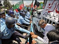 جب ریلی کے شرکاء شاہراہ دستور سے سپریم کورٹ کی عمارت کی طرف جانے لگے تو پولیس اہلکاروں کے ساتھ اُن کی ہاتھا پائی بھی ہوئی تاہم وکلاء کے ہاتھوں میں’ کٹر‘ تھے جس سے انہوں نے سڑک پر بچھائی گئی لوہے کی تاروں کو کاٹ دیا اور وہ سپریم کورٹ کے سامنے جمع ہوگئے۔ مظاہرین کے مقابلے میں پولیس اہلکاروں کی تعداد کم تھی اور صورتحال دیکھتے ہوئے پولیس اہلکار ایک طرف ہوگئے۔ لاہور میں خطاب کرتے ہوئے اعتزاز احسن نے کہاکہ ہفتہ وار دو گھنٹوں کے لیے دھرنے کی تجویز انیس جولائی کو لاہور میں ہونے والے وکلاء کنونشن میں منظوری کے لیے پیش کی جائے گی۔ ان کے بقول دو گھنٹوں تک ہر جمعرات کو دھرنا دینا موثر اور قابل عمل تجویز ہے۔ انہوں نے ملک کی مختلف ہائی کورٹ بار ایسوسی ایشنوں کی طرف سے عدالتوں کی تالابندی کرنے کی تجویز کی مخالفت کی ۔انہوں نے خدشہ ظاہر کیا کہ وکلاء قیادت کو عدالتوں کی تالا بندی کرانے سے پہلے ہی گرفتار کرلیا جائے۔ سپریم کورٹ بار ایسوسی ایشن کے صدر نے انکشاف کیا کہ حکومت معزول ججوں سے رابطے کررہی ہے لیکن ’اگر کسی جج نے جسٹس افتخار محمد چودھری کے بغیر حلف لیا تو وکلاء انہیں پی سی او جج تصور کریں گے۔‘ دوسری جانب جماعت اسلامی کے امیر قاضی حسین احمد نے لاہور کی ضلعی بار سے خطاب کرتے ہوئےآئینی پیکیج پر نکتہ چینی کی اور کہا کہ اس پیکیج کے ذریعے صدر پرویز مشرف کے تین نومبر کے اقدامات کو تحفظ دیا جارہا ہے۔ قاضی حسین نے فنانس بل کے ذریعے ججوں کی تعداد بڑھنے کی مخالفت کی اور کہا کہ ججوں کی تعداد بڑھنے کا مقصد صرف پی سی او ججوں کو ان کے عہدوں پر برقرار رکھنا ہے۔ قاضی حسین احمد کے خطاب کے بعد وکلاء نے ایوان عدل سے جلوس نکالا اور یہ جلوس ہائی کورٹ کے سامنے پہنچا تو سپریم کورٹ بار کے صدر اعتزاز احسن کی قیادت میں ہائی کورٹ بار کے وکیل بھی شامل ہوگئے۔ |