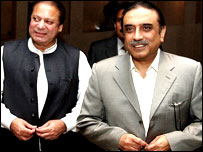 ادھر وزیر اعظم یوسف رضا گیلانی نے کہا ہے کہ ججوں کی بحالی صدر پرویز مشرف کو ہٹانے سے زیادہ مشکل کام نہیں اور جلد ہی تمام جج بحال ہوں گے جس کے بعد مسلم لیگ نون سے درخواست کی جائے گی کہ وہ حکومتی اتحاد سے الگ ہونے کے فیصلے پر نظر ثانی کرے۔ اسلام آباد میں صحافیوں کے ساتھ بات چیت کے دوران جب ان سے معزول چیف جسٹس افتخار محمد چودھری کی بحالی کے امکانات کے بارے میں پوچھا گیا تو ان کا جواب تھا ’آپ کا کیا خیال ہے شمار تسبیح دانہ میں امام نہیں۔ وہ تو امام ہیں وہ تو (بحال) ہوں گے۔‘ انہوں نے کہا کہ ججوں کی بحالی پیپلز پارٹی کے منشور کا حصہ ہے اور بے نظیر بھٹو کا بھی یہ وعدہ تھا۔ دوسری طرف قومی اسمبلی میں اپوزیشن لیڈر اور مسلم لیگ قاف کے رہنما چودھری پرویز الہی نے کہا ہے کہ پیپلز پارٹی اور مسلم لیگ نون کی طرف سے ان کی جماعت سے رابطے کئے جا رہے ہیں۔ انہوں نے کہا کہ ’وزیر اعظم صاحب سے بھی ملاقات ہوئی ہے کافی باتیں ہوئی ہیں خورشید شاہ صاحب سے بھی تفصیلی باتیں ہوئی ہیں۔ دوسری طرف کے مسلم لیگ نون کے جو دوست ہیں، ان کے ساتھ بھی بات چیت ہوئی ہے۔‘ | اسی بارے میں نواز شریف سے معذرت: زرداری25 August, 2008 | پاکستان حکمراں اتحاد، کب کیا ہوا25 August, 2008 | پاکستان معاہدے حدیث یا قرآن نہیں: زرداری23 August, 2008 | پاکستان ججوں کی بحالی پیر تک کریں: نواز23 August, 2008 | پاکستان عدلیہ کی بحالی کے لیےایک اور ڈیڈلائن22 August, 2008 | پاکستان ’سمجھوتے کی پوزیشن میں نہیں‘22 May, 2008 | پاکستان ’ججوں کی بحالی آئین میں نہیں‘16 May, 2008 | پاکستان بحالی قرار داد کے ساتھ آئینی پیکج02 May, 2008 | پاکستان | ||||||||||||||||||||||||||||||||||||||||