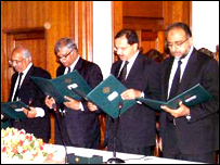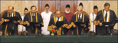 سابق صدر پرویز مشرف کے عبوری آئینی حکمناے یا پی سی او کے تحت حلف نہ اٹھانے کی پاداش میں معزول کیئے جانے والے ججوں میں سے مزید چار نے ہفتے کو اپنے عہدے کا نیا حلف اٹھا لیا ہے۔ حلف اٹھانے والوں میں سپریم کورٹ کے دو معزول ججز جسٹس سردار رضا خان اور جسٹس ناصر الملک جبکہ سندھ ہائی کورٹ کے دو ججز جسٹس صبیح الدین احمد اور جسٹس سرمد جلال عثمانی شامل ہیں۔ ان چاروں ججوں نے سابق صدر پرویز مشرف کی طرف سے سن دو ہزار سات میں جاری ہونے والے عبوری آئینی حکمناے (پی سی او) کے تحت سیرپم کورٹ کے چیف جسٹس کا حلف اٹھانے والے جسٹس عبدالحمید ڈوگر نے حلف لیا۔
