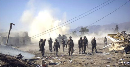 ٹینک پر سوار سکیورٹی فورسز کے اہلکار تقریباً دو کلومیٹر کے فاصلے پر ایک عمارت کو نشانہ بنارہے تھے اور ہمیں بتایاگیا کہ یہاں سے گولیوں کی آوازیں آئی ہیں۔ آس پاس کے گاؤں میں کوئی بھی مقامی شخص نظر نہیں آیا۔یہاں زمین پر فوجی تھے اور فضاء میں گولیوں کی آوازیں۔ اس دوران میجر اعجاز نے صحافیوں کو بتایا کہ چھ اگست کو جب وہ سو اہلکاروں کے ہمراہ پہلی بار چیک پوسٹ قائم کرنے لوئی سم آئے تو طالبان نے ان کا محاصرہ کیا اور پیچھے سے انکی سپلائی لائن منقطع کرلی۔ وہ چار دنوں تک محاصرے میں رہے اور چند ساتھیوں کی ہلاکت کے بعد ہی بحفاظت نکلنے میں کامیاب ہوئے۔ ایک گھنٹہ گزارنے کے بعد جب واپس رشکئی کے علاقے آئے تو یہاں پر اچانک شدید فائرنگ کاسلسلہ شروع ہوا۔ پہلے تو یہی بتایا گیا کہ فائرنگ سکیورٹی فورسز نے کی ہے لیکن جب گولیاں صحافیوں کے قریب لگیں تو پھر کہا گیا کہ مبینہ عسکریت پسندوں نے فائرنگ کی ہے۔ اس کے بعد ہم ٹانک خطاء کے علاقے میں آئے جہاں پر کرنل جاوید بلوچ نے بتایا کہ انہوں نے کیسے مبینہ عسکریت پسندوں سے ٹھکانے خالی کرائے۔ہم جس کچے مکان میں بیٹھے ہوئے تھے اس کے بارے میں بتایا گیا کہ یہ طالبان کا ٹھکانہ تھا۔ کرنل جاوید کا کہنا تھا کہ ابتداء میں مسلح طالبان کے ساتھ لڑنا قدرے مشکل تھا مگر بعد میں انہیں انکی جنگی حکمت عملی کی جب سمجھ آئی تو پھر انہیں کامیابی حاصل ہوئی۔ ان کا کہنا تھا کہ مسلح طالبان کو سب سے بڑا فائدہ یہ حاصل تھا کہ انہیں علاقے کے بارے میں زیادہ جانکاری تھی اور انہیں مقامی لوگ کھانا پینا مہیا کرتے تھے۔انہوں نے سرنگیں کھودی تھیں اور حملے کے وقت بھاگ کر نکل جاتے تھے۔ان کے بقول وہ چھپے کسی ایک مکان میں تھے مگر سکیورٹی فورسز کو دھوکہ دینے کے لیے کسی دوسرے مکان میں دستی بم پھینک کر یہ تاثر دینے کی کوشش کرتے تھے کہ وہ وہاں ہیں۔ اس موقع پر صحافیوں کو پشتو زبان میں عسکری تربیت دینے کی ایک کتاب دکھائی گئی جس کے بارے میں دعوی کیا گیا کہ مشتبہ ٹھکانے سے اسے بھی بعض دیگر چیزوں کے ساتھ قبضہ میں لیا گیا ہے۔اس کتاب میں راکٹ لانچر، مارٹر، میزائل، کلاشنیکوف اور دیگر جدید اسلحے کی تصاویر دی گئی تھیں اور ان کے استعمال کے بارے میں تفصیلات درج تھیں۔ کتاب میں سٹیلائٹ فون کی تصویر دی گئی تھی جس کے مختلف حصوں کے نام بتائے گئے تھے اور اس کے استعمال کا طریقہ لکھا ہوا ہے۔اس میں کیمیائی ہتھیار بنانے میں استعمال ہونے والے کیمیائی عناصر جیسے فاسفورس، پوٹاشیم نائٹریٹ وغیرہ کے فارمولے دیئے گئے تھے اور اسکی مقدار اور دستیاب ہونے کے مقامات کی تفصیل کو ایک جدول میں ظاہر کیا گیا تھا۔ ’ فوجی تربیت برائے مجاہدین‘ کے نام سے اس کتاب پر پبلشر کا نام نہیں لکھا گیا تھا۔قبضہ میں مبینہ طور پر ملنے والی کتابوں میں مولانامسعود اظہر کی ’خطباتِ جہاد‘ کے نام سے بھی ایک کتاب دکھائی گئی جس کا دیباچہ کراچی کے بنوری ٹاؤن کے مقتول مہتم مولانا مفتی شامزئی نے لکھا ہے۔ | اسی بارے میں چالیس طالبان کی ہلاکت کا دعویٰ12 September, 2008 | پاکستان تیس طالبان کی ہلاکت کا دعویٰ13 September, 2008 | پاکستان باجوڑ:’تازہ حملوں میں تیس ہلاک‘14 September, 2008 | پاکستان ’پانچ دن میں 117 طالبان ہلاک‘15 September, 2008 | پاکستان ’غیر ملکی جنگجو مرکز نشانہ‘16 September, 2008 | پاکستان باجوڑ آپریشن میں 19 طالبان ہلاک17 September, 2008 | پاکستان | ||||||||||||||||||||||||||||||||||||||||