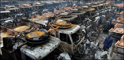 پشاور میں حکام کا کہنا ہے کہ افغانستان میں تعینات اتحادی افواج کو سامان لے جانے والے ٹرکوں کے ایک اور اڈے کو نامعلوم مسلح افراد نے آگ لگائی گئی ہے جس سے پچاس سے زائد ٹرک تباہ ہوگئے ہیں۔ پشاور میں اڑتالیس گھنٹے میں نیٹو اور امریکی سپلائی پر دوسرا حملہ ہے۔ گزشتہ روز بھی دو ٹرمینلز پر حملوں میں نیٹو افواج کے سازوسامان سمیت دو سو سے زائد گاڑیاں تباہ کی گئیں تھیں۔ تازہ واقعہ پشاور کے علاقے رنگ روڈ پر پندو چوک کے قریب گزشتہ رات تین بجے کے قریب پیش آیا۔ تھانہ یکہ توت کے ایک اہلکار فدا محمد بی بی سی کو بتایا کہ درجنوں مسلح افراد رات کے تاریکی میں اچانک بلال ٹرمینل میں داخل ہوئے اور وہاں کھڑی ٹرکوں پر تیل چھڑک کر اسے آگ لگائی۔ انہوں نے کہا کہ مسلح افراد نے ٹرمینل پر راکٹ فائر نہیں کئے بلکہ کوئی جلتی ہوئی چیز پھینکی گئی جس سے وہاں آگ بھڑک اٹھی۔ ٹرمینل کے ایک ہلکار نے بتایا کہ علاقے میں ان کے محافظ بھی موجود تھے تاہم انہیں بالکل معلوم نہیں ہوسکا کہ مسلح افراد کیسے اچانک ٹرمینل کے اندر داخل ہوئے۔ انہوں نے کہا کہ آگ اتنی تیزی سے پھیلی کہ اس نے چند ہی منٹوں میں سارے علاقے کو گرے میں لے لیا۔ اہلکار نے بتایا کہ آگ سے پچاس سے زائد ٹرک مکمل طورپر تباہ تبدیل ہوگئے ہیں۔ انہوں نے کہا ٹرکوں پر فوجی سازوسامان نہیں لدھا ہوا تھا بلکہ ساری گاڑیاں خالی تھی۔ پشاور میں نیٹو افواج کو سامان رسد لے جانے والی گاڑیوں پر گزشتہ دو دن میں یہ دوسرا مسلسل حملہ ہے۔ سنیچر کی رات بھی رنگ روڈ پر تقریباً تین سو کے قریب مسلح افراد نے اتحادی افواج کو فوجی اور دیگر سازوسامان لے جانے والے گاڑیوں پر راکٹ لانچروں اور دیگر خودکار ہتھیاروں سے حملہ کیا تھا جس میں دو سے زائد کنٹنیرز تباہ ہوگئے تھے۔ ان گاڑیوں میں بکتر بند اور دیگر گاڑیاں شامل تھیں۔ دوسری طرف پشاور میں ان مسلسل حملوں سے شہر کے لوگوں میں سخت تشویش کی لہر دوڑ گئی ہے۔ مسلح افراد جس دیدہ دلیری سے پشاور کے اندر حملے کر رہے ہیں اس سے بظاہر لگتا ہے کہ صوبائی حکومت ان حملوں کو روکنے میں بے بس نظر اتی ہے۔ | اسی بارے میں رسد کا متبادل راستہ، ایک چال؟03 April, 2008 | پاکستان ’نیٹو افواج رسد پِیر سے بحال‘16 November, 2008 | پاکستان آئل ٹینکرز کی تباہی، سات گرفتار24 March, 2008 | پاکستان نیٹو رسد، سکیورٹی میں قافلہ روانہ17 November, 2008 | پاکستان ’وزارت خارجہ کو نظر انداز کیا گیا‘ 13 November, 2008 | پاکستان ’انگور اڈہ گولہ باری طالبان نے کی‘12 July, 2008 | پاکستان نیٹو کو تیل کی فراہمی کا انتقام؟26 September, 2008 | پاکستان | ||||||||||||||||||||||||||||||||||||||||