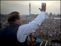 انہوں نے جلسے میں موجود لوگوں سے لانگ مارچ میں شرکت کرنے کی اپیل کی۔ نواز شریف نے بتایا کہ وہ مصالحتی کمیٹی کی آمد کی وجہ سے ریلی میں شرکت نہ کرسکے۔ اس سے قبل سابق وزیر اعلیْ پنجاب شہباز شریف نے خطاب کرتےہوئے آصف زرداری پر نکتہ چینی کی اور کہا کہ وہ یہ مذاق چھوڑ دیں کہ ایک طرف مذاکراتی ٹیم بھجوائی ہے اور دوسری طرف صوبے میں گورنر راج لگاکر مویشوں کی منڈی لگائی ہے۔ ان کے بقول قومی خزانے کے وسائل استعمال کرکے خرید وفروخت کی جا رہی ہے۔ ان کا کہنا ہے کہ وہ نہ کسی این آر او کی پیداوار ہیں اور نہ ہی انہوں نے کسی سے فراڈ کیا ہے۔انہوں نے مزید کہا کہ صدر زرداری نوازشریف کو اپنا بڑا بھائی کہتے تھے اور اب اسی بڑے بھائی کو ان ججوں سے نااہل قرار دلوادیا ہے جنہوں نے پی سی او کے تحت حلف اٹھایا تھا۔شہباز شریف نے صدر زرداری سے کہا کہ روٹی، کپڑا اور مکان ان کے بڑوں کا نعرہ تھا لیکن دو روپے سستی روٹی فراہم کرنے کا اعزاز مسلم لیگ نون کو ملا ہے۔