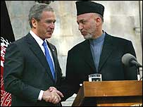 جارج بش نے بالخصوص افغانستان کی طرف سے لڑکیوں کے سکول قائم کرنے کی مہم کی تعریف کی۔ صدر بش کے ساتھ سفر کرنے والے بی بی سی کے ایک نامہ نگار کا کہنا ہے کہ امریکی صدر کے افغانستان دورے کا مقصد حامد کرزئی کو اخلاقی مدد فراہم کرنا ہے۔ صدر بش افغانستان میں موجود بیس ہزار امریکی فوجیوں سے بھی خطاب کریں گے۔ یہ خطاب بگرام کے ہوائی اڈے پر ہوگا۔ اس سے قبل صدر بش کا خصوصی طیارہ بٹگرام کے ہوائی اڈے پر اترا جہاں افغان صدر حامد کرزئی نے ان کا استقبال کیا۔ بٹگرام کے ہوائی اڈے سے امریکی صدر کو کابل کے صدارتی محل لیے جایا گیا۔ صدر بش اور افغان صدر کے درمیان کابل کے صدراتی محل میں مذاکرات ہوئے۔ طالبان کی حکومت ختم ہونے کے بعد بش پہلے مرتبہ کابل گئے ہیں۔ ان کے کابل کے دورے کا پہلے سے اعلان نہیں کیا گیا تھا۔