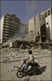 جنوبی بیروت پر اسرائیلی فضائیہ کی بمباری میں کم سے کم پانچ افراد کی ہلاکت کی اطلاع مل رہی ہے۔ اس کے علاوہ جنوبی لبنان پر اسرائیل نے مزید حملے شروع کیے جس میں جس میں بری، بحری اور فضائیہ حصہ لے رہی ہیں۔ ظائر کے نواح میں بیس افراد کے ہلاک ہونے کی اطلاع ہے اور اسرائیل نے جنوبی لبنان کے لوگوں کو متنبہ کیا ہے کہ وہ مقامی وقت کے مطابق دس بجے رات کے بعد سے گھروں سہ باہر نہ نکلیں ورنہ ان کی جانیں جانے کا خطرہ ہو سکتا ہے۔ اس دوران اسرائیلی وزیراعظم ایہود المرت نے تمام یہودیوں سے اپیل کی ہے کہ وہ اسرائیل سے یکجہتی کا مظاہرہ کریں کیونکے اسرائیل اپنی بقا کی بہیمانہ جنگ لڑ رہا ہے اور اس کی بھاری قیمت چکا رہا ہے۔ ان کا کہنا ہے کہ یہ قیمت اس چکانہ بہتر ہے چہ جائیکہ انتظار کیا جائے اور حزب اللہ کو اور بہتر انداز سے مسلح ہونے کا موقع دیا جائے۔ ان کا کہنا ہے کہ اسرائیل اور حزب اللہ کے درمیان فرق یہ کہ اسرائیل شہری ہلاکتوں کو اپنی ناکامی تصور کرتا ہے جب کہ حزب اللہ اسے اپنی کامیابی تصور کرتا ہے۔ لبنان کے وزیراعظم فواد سینیورا نے کہا ہے کہ جنوبی لبنان کے گاؤں حولا پر اسرائیلی حملے میں 40 نہیں ایک شخص ہلاک ہوا۔ اس سے قبل آج فواد سینیورا نے بیروت میں عرب لیگ کے وزرائے خارجہ کے ایک اجلاس کے دوران کہا تھا کہ حولا پر اسرائیلی حملے میں 40 افراد ہلاک ہوگئے ہیں۔ عرب لیگ کے اجلاس کو خطاب کرتے ہوئے لبنانی وزیراعظم نے کہا تھا کہ ’ایک گھنٹے قبل حولا نامی گاؤں میں ایک خوفناک قتل عام ہوا ہے جس میں 40 شہداء دانستہ بمباری کا شکار ہوئے ہیں۔‘ حولا سے ملنے والی تازہ اطلاعات میں کہا گیا ہے کہ جس عمارت پر اسرائیلی فوج نے بمباری کی تھی اس کے شیلٹر میں پچاس افراد زندہ پائے گئے ہیں۔ حولا پر حملہ ایک ایسے دن ہوا جس دن دوسرے اسرائیلی حملوں میں کم سے کم پندرہ افراد ہلاک ہوگئے۔ اس دوران عرب لیگ نے اپنا ایک وفد نیویارک بھیج دیا ہے جو اقوام متحدہ کی سلامتی کونسل کے سامنے وہاں زیربحث قراردادِ امن میں لبنان کی جانب سے جن ترامیم کا مطالبہ کیا گیا ہے ان کی حمایت کرے گا۔ وفد بھیجنے کا فیصلہ عرب لیگ کے وزرائے خارجہ نے پیر کے روز بیروت میں ہونے والے اپنے اجلاس میں کیا۔ ادھر امریکی صدر جارج بش نے کہا ہے کہ وہ قراردادِ امن پر لبنان اور حزب اللہ کے اعتراضات سے آگاہ ہیں اور فوری طور پر جنگ بندی کی قرارداد کی منظوری کے لیے کام کریں گے۔ امریکی صدر نے کہا: ’ہم سب یہ مانتے ہیں کہ تشدد فوری طور پر ختم ہونا چاہیے۔‘ لبنان پر اسرائیلی حملوں میں لبنانی حکومت کے مطابق گزشتہ ستائیس دنوں میں 1000 کے لگ بھگ افراد ہلاک ہوئے ہیں جبکہ حزب اللہ سے لڑائی کے دوران اور اسرائیل پر حزب اللہ کے حملوں میں 90 سے زائد اسرائیلی مارے گئے ہیں جن میں بیشتر فوجی ہیں۔