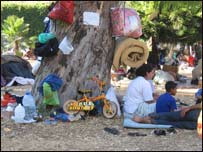 احمد نے بتایا کہ یہاں کے لوگ میڈیا والوں سے بہت تنگ ہیں۔ ہر وقت کوئی نہ کوئی کیمرہ ٹیم موجود ہوتی ہے۔ اس بیزاری کا اندازہ مجھے فوراً ہی ہوگیا جب احمد فرخ نے دو تین لوگوں کو میرے بارے میں بتایا توانہوں نے ہاتھ کے اشارے سے منع کردیا۔ ایک درخت کے نیچے سیاہ چادر میں ملبوس ایک ادھیڑ عمر عورت اپنے دو بچوں کو کھانا کھلا رہی تھی اور ایک نسبتاً جوان عورت کوئی کتاب پڑھ رہی تھی۔ سیاہ پوش خاتون کا نام فاطمہ تھا اور یہ سب اسرائیل لبنان سرحد پر واقع گاؤں بنتِ جبیل سے آئے تھے جسے اسرائیلی اٹھائیس دن کے بعد بھی قابو میں نہیں لا سکے۔ فاطمہ نے بتایا کہ اس کا شوہر حزب اللہ میں شامل ہے۔ ’وہ خود محاذ پر ہے اور ہم اس لیئے گاؤں سے نکلے کیونکہ بنتِ جبیل میں لڑائی کے شروع میں جو گھر تباہ ہوئے تھے ان میں ہمارا گھر بھی شامل تھا‘۔ فاطمہ کے بقول یہ کوئی نئی ہجرت نہیں ہے۔ انیس سو چھیانوے میں بھی اسرائیلی توپوں نے گھر چھڑوا دیا تھا لیکن اس دفعہ تو وہ گھر بھی نہیں بچا۔ پارک میں ایک بنچ پر ایک بڑے میاں اکیلے بیٹھے بہت دم لگا کر سگریٹ کے کش لے رہے تھے۔ انہوں نے اپنا نام بتانے سے انکار کردیا۔ بس یہ بتایا کہ ان کا تعلق سیدا کے نزدیک ال عون نامی گاؤں سے ہے۔ بیوی اور چار بچوں کے ساتھ کسی ٹرک میں بیٹھ کر یہاں آ گئے۔ دس دن ہوگئے، بغیر چھت کے یوں لگ رہا ہے جیسے اجنبیوں کے درمیان فٹ پاتھ پر بیٹھے ہوں۔ ’بس اب میں سوچ رہا ہوں کہ بہت ہوگیا۔ اگلے چند دن اور دیکھوں گا اس کے بعد امن قائم ہویا نہ ہو میری بلا سے۔ میں دوبارہ اپنے گاؤں جاؤں گا۔ اگر شہر میں اسی طرح رہنا ہے تو گاؤں کی موت اس سے بہت اچھی ہے‘۔ ان بڑے میاں سے ذرا آگے پانچ مرد بستر بچھائے تاش کھیل رہے تھے۔احمد فرخ نے ان سے پوچھا کہ کیا آپ بی بی سی سے کچھ بات کرنا پسند کریں گے۔ پانچوں نے ایک ساتھ ہاتھ ہلا دئیے جس کا مطلب تھا نہیں۔ ان میں سے ایک بہت دیر تک احمد سے عربی میں کچھ کہتا رہا، جس کا لبِ لباب یہ تھا کہ ہم اس لیئے بات نہیں کرنا چاہتے کیونکہ اگر منہ سے برطانیہ، امریکہ یا اسرائیل کے لیئے کوئی فحش کلامی ہوگئی تو اس بے چارے کی نوکری جائے گی اور اسے عربی نہیں آتی۔ احمد نے مجھے مشورہ دیا کہ ان سے بات نہ کرنا زیادہ بہتر ہے۔ ثنائیہ پارک کے عین وسط میں ایک بڑا سا فوارہ ہے۔ آج کل خشک پڑا ہے۔ اس کے اندر ایک پچاس پچپن برس کی خاتون غالباً اپنے پوتے کے ساتھ کھیلتے ہوئے اسکے پیچھے چھوٹے چھوٹے قدموں سے بھاگ رہی تھیں۔ احمد نے ان سے بات کی۔ وہ اسے کچھ سمجھانے لگیں۔ میں نے مائیکروفون آگے کردیا۔ انہوں نے ہاتھ سے جھٹک دیا۔ احمد نے مجھے بتایا کہ یہ ملکہ برطانیہ پر بڑے غصے میں ہیں۔ میں نے کہا کوئی مسئلہ نہیں یہ اپنے جذبات کا اظہار کر سکتی ہیں۔