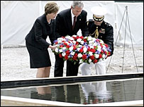 امریکہ میں سابقہ ورلڈ ٹریڈ سینٹر کے مقام پر گیارہ ستمبر کے حملوں کی یاد میں ایک منٹ کی خاموشی اختیار کی گئی۔ آگ بجھانے والے عملے کے اراکین کے ساتھ امریکی صدر بش بھی ایک منٹ کی خاموشی کی اس تقریب میں شریک تھے۔ یہ خاموشی ٹھیک اسی وقت اختیار کی گئی جب پہلا جہاز شمالی ٹاور سے ٹکرایا تھا۔ اس موقع پر گھنٹیاں بجائی گئیں اور گروپ نے مل کر دعائیہ گیت گایا۔ ہلاک ہونے والے دو ہزار نو سو تہتر افراد میں سے ایک کی بیوی نے ایک دعائیہ گیت گایا۔ دوران تقریب نیویارک کے میئر مائیکل بلوم برگ نے ایک نظم پڑھی۔ امریکی صدر بش پینسلوینیا اور واشٹنگن میں پینٹاگون کی تقریبات میں بھی شرکت کریں گے۔ امریکہ پر پانچ سال پہلے دہشت گردانہ حملے میں ہلاک ہونے والوں کی یاد میں تقریبات شروع ہو گئی ہیں۔ان حملوں میں تقریباً تین ہزار لوگ مارے گئے تھے۔ تقریبات کا آغاز صدر بش نے ورلڈ ٹریڈ سینٹر کی جگہ گراونڈ زیرو پر پھول چڑھانے سے شروع ہوا۔ اس سے قبل صدر بش نے امریکہ پر دہشت گردانہ حملوں کو پانچ سال مکمل ہونے کی تقریبات کا افتتاح کیا۔ صدر نے ورلڈ ٹریڈ سنٹر کی جگہ بنائی جانے والی یادگار گراؤنڈ زیرو پر پھول چڑھائے۔ بعد میں صدر بش نے ایک قریبی گرجا گھر میں یادگاری سروس میں شرکت کی۔ انہوں نے کہا کہ گیارہ ستمبر کا دن بہت سارے لوگوں کے لیئے دکھ کا پیغام لے کر آتا ہے۔