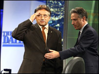 ایسا روز روز نہیں ہوتا کہ کسی اسلامی ملک کا صدر کسی مزاحیہ شو میں آئے اور اسامہ بن لادن پر مذاق کرے۔ تاہم پاکستان کے صدر پرویز مشرف کے ساتھ منگل کے روز ایسا ہی ہوا اور وہ بھی اپنی کتاب کی تشہیر کے دوران۔ گزشتہ ہفتے صدر مشرف نے صدر بش کے ساتھ پریس کانفرنس کو اپنی کتاب کی تشہیر کے لیئے استعمال کیا تھا اور اب امریکہ کے مقبول ترین مزاحیہ پروگرام کو۔ خبر رساں ادارے اے ایف پی کے مطابق جب ’ڈیلی شو ود جان سٹیورٹ‘ کے میزبان نے صدر مشرف کے لیئے چائے بناتے ہوئے بڑے آرام سے پوچھا کہ اسامہ بن لادن کہاں ہیں؟ تو صدر نے فوراً جواب دیا کہ ’مجھے معلوم نہیں۔ اگر آپ کو معلوم ہے کہ وہ کہاں ہے تو آگے بڑھیں، ہم آپ کے پیچھے چلیں گے‘۔ ’ڈیلی شو ود جان سٹیورٹ‘ امریکہ میں بہت مقبول ہے اور اسے تقریباً پچیس لاکھ ناظرین دیکھتے ہیں۔ سٹیورٹ نے ایک ہی علاقے میں صدر مشرف پر دو قاتلانہ حملوں کا مذاق اڑاتے ہوئے کہا کہ ’ دفتر جانے کے لیئے کسی نئے راستے کا انتخاب کر لیا ہوتا‘ ۔