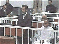 ( صدام کی سیاسی تقریر شروع ہوتے ہی جج ان کا مائیک بند کر دیتے ہیں) جج: آپ اپنی عزت ملحوظِ خاطر رکھیں! صدام: : (چیخ کر کہتے ہوئے) تم اپنی عزت کا خیال رکھو! جج: آپ ایک بڑے مقدمے کے ایک ملزم ہیں جس کا تعلق معصوم لوگوں کی ہلاکتوں سے ہے۔ آپ کو اس الزام کے بارے میں بات کرنی چاہیے۔ صدام: بغداد میں مرنے والے افراد کے بارے میں آپ کا کیا خیال ہے؟ کیا یہ لوگ معصوم نہیں ہیں؟ میں عراقی عوام سے مخاطب ہوں۔ صدام اور جج عبدالرحمن: 22 مئی 2006 صدام، اپنے وکلاء میں سے ایک وکیل کے خارج کیے جانے کے معاملے پر اعتراض کرتے ہوئے کہتے ہیں: میں صدام حسین ہوں۔ عراق کا صدر۔ میں تم اور تمہارے باپ کے اوپر ہوں۔ جج: (غصے سے) اب آپ ایک صدر نہیں بلکہ ایک ملزم ہیں۔ |