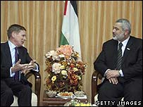 غزہ میں بی بی سی کے لاپتہ صحافی ایلن جانسٹن کی بازیابی کے لیے کی جانے والی کوششوں کے سلسلے میں ایک برطانوی سفارت کار نے حماس کے رہنما وزیر اعظم اسماعیل ہنیہ سے ملاقات کی ہے۔ برطانیہ کے کسی سفارت کار کی حماس کے رہنما اسماعیل ہنیہ سے یہ پہلی ملاقات تھی۔ برطانیہ حماس کو ایک دہشت گرد تنظیم قرار دیتا ہے اور اس سے کسی قسم کا رابطہ کرنے سے اجتناب کرتا رہا ہے۔ بی بی سی کے نامہ نگار ایلن جانسٹن بارہ مارچ سے غزہ سے لاپتہ ہیں اور عام خیال یہی ہے کہ انہیں اغواء کیا گیا ہے۔ یروشلم میں برطانوی قونصل جنرل رچرڈ میکپیس نے کہا ہے کہ غزہ میں اسماعیل ہنیہ سے یہ ملاقات صرف اور صرف یہ انسانی مسئلہ حل کرنے کے لیے کی گئی تھی۔ فلسطینی صدر محمود عباس نے بھی غزہ میں حماس کے رہنما اسماعیل ہنیہ سے اس سلسلے میں ملاقات کی تھی جہاں انہیں فلسطین کے صحافیوں کے ایک احتجاجی مظاہرے کا بھی سامنا کرنا پڑا تھا۔
